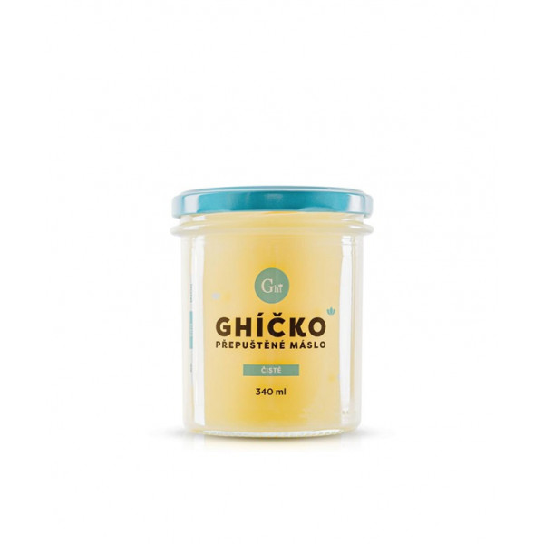 Složení:bezvodý máselný tuk min.99%. Přepuštěné máslo. Ghí vzniká dlouhým a pomalým procesem. Výsledkem je čistý máselný tuk bez obsahu vody a mléčné bílkoviny. Nepřepluje se. Kvalitní tuk nejen na smažení.