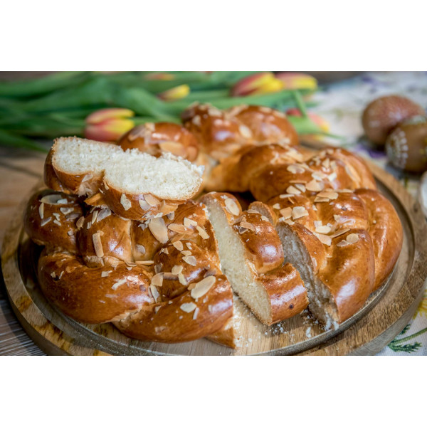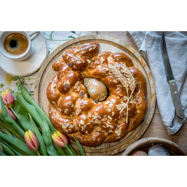 Věnec je vyroben z kynutého těsta, z pšeničné mouky.