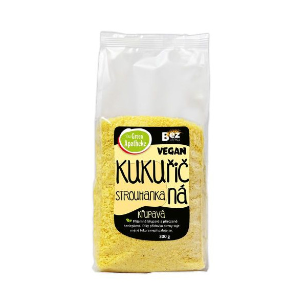 Příjemně křupavá a přirozeně bezlepková. Na obalování a smažení, zahušťování, vaření i pečení. Příjemně křupe a v porovnání s klasickou strouhankou nesaje tolik tuk. Složení: kukuřice (78%), cizrna. Může obsahovat stopy celeru
